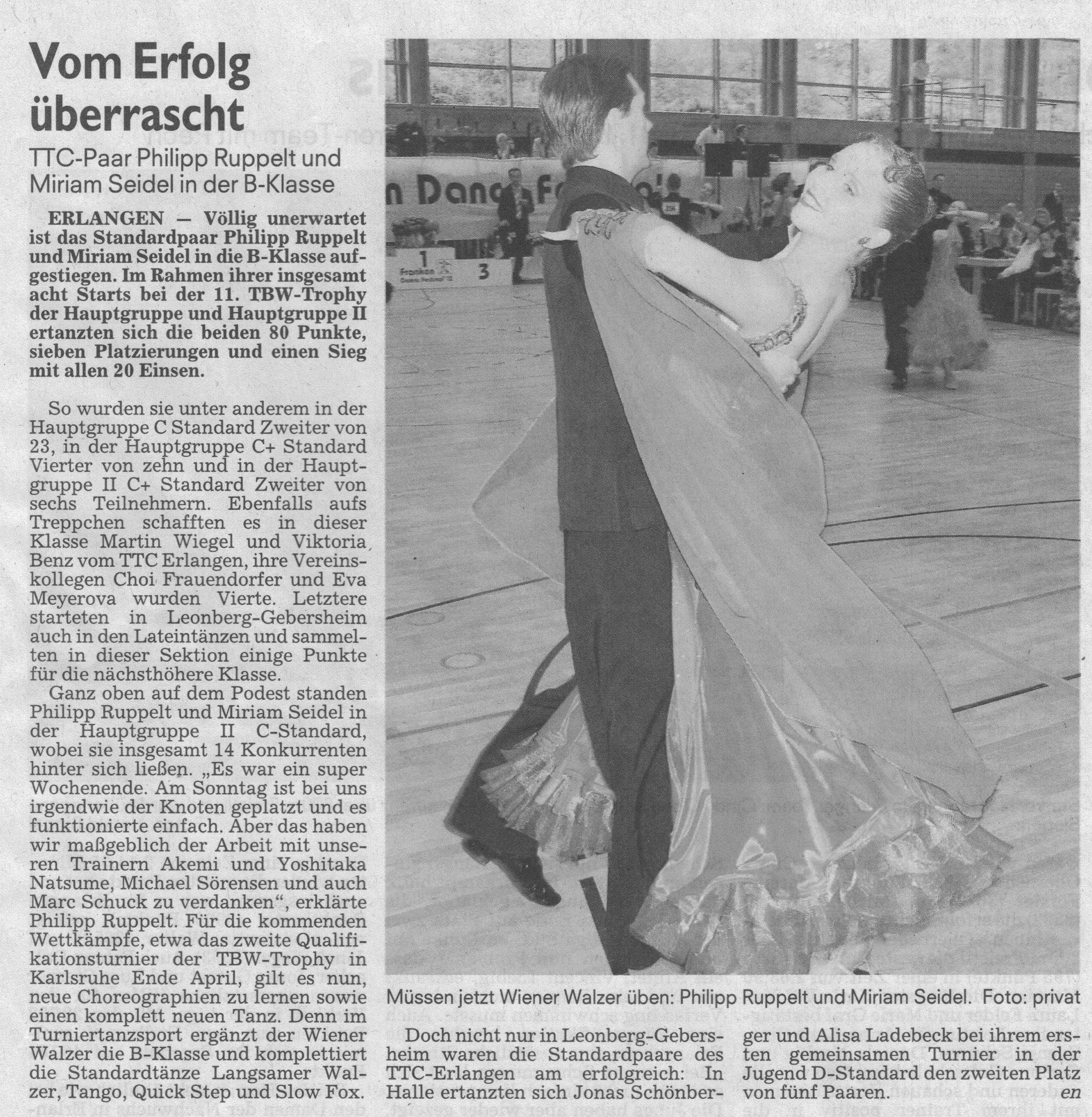 Zeitungsausschnitt der Erlanger Nachrichten 02/2013 Aufstieg in die B-Klasse im Standardtanz
